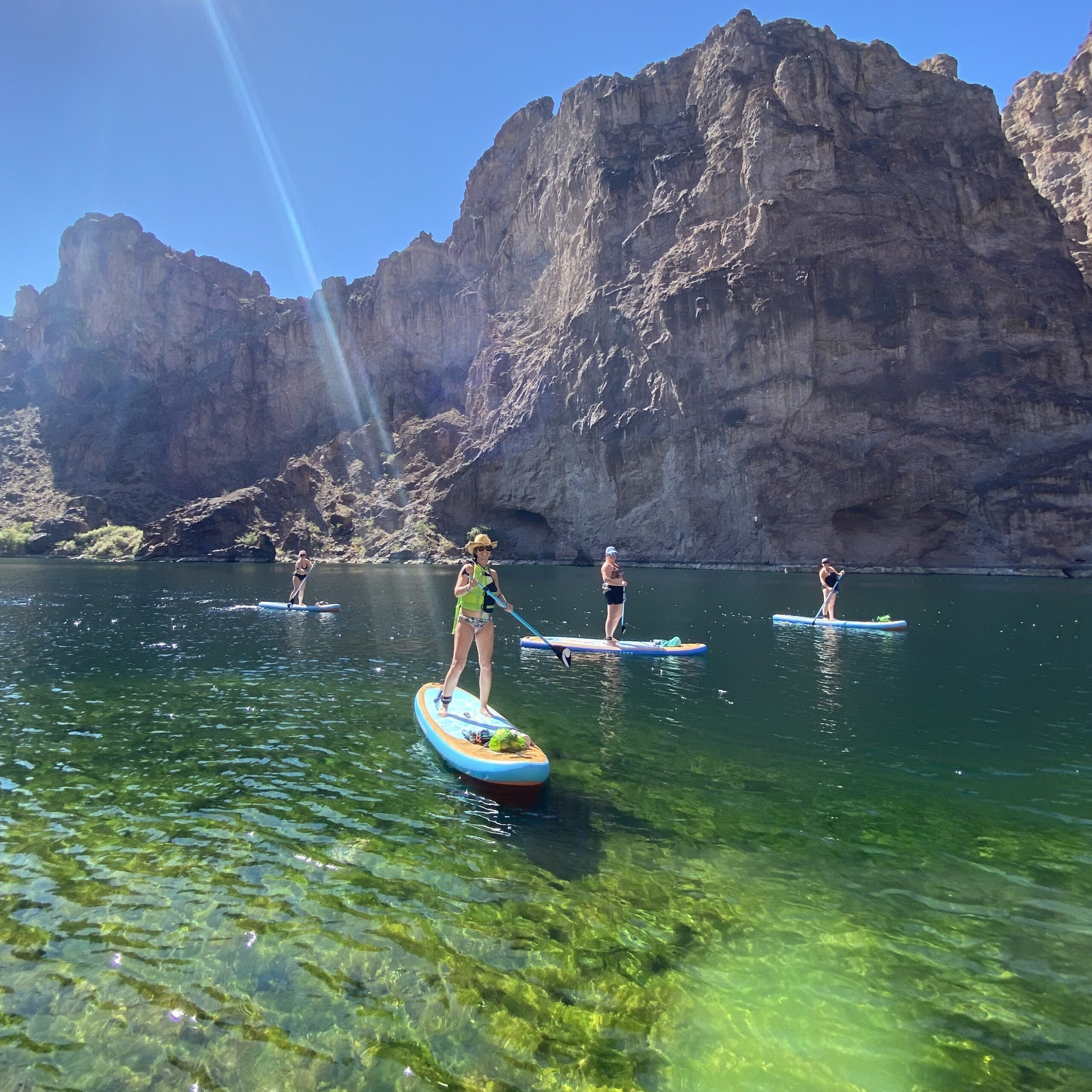 Join us for an Emerald Cave paddle board tour at Willow Beach AZ, where the crystal-clear waters of the Colorado River and towering canyon walls create an unforgettable majestic paddling experience. Your Emerald Cave paddle board tour includes a private guide exclusively for your group, providing you with a personalized experience and a private guide all to yourselves!